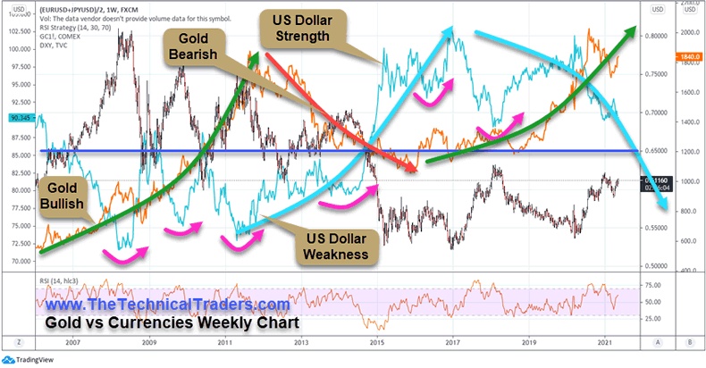 上面的每周黄金与货币图表可能看起来有些复杂,所以让我尝试解释一下我要说明的内容。