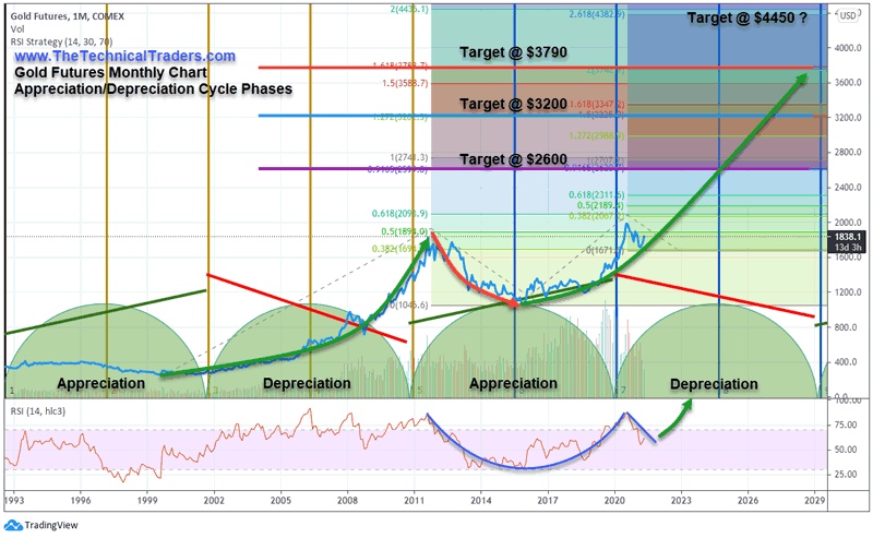 下方的每月黄金期货图表重点介绍了过去25年以上的升值/折旧阶段以及黄金的上涨/下跌价格。