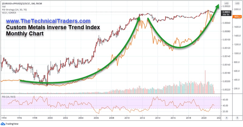 下面的以下“每月自定义金属逆趋势”图表突出显示了与黄金相比,货币相关性的底部/基准形成。您可以看到黄金在2011年的峰值和2015年的最低点之间建立的中等深度底部,以及近期黄金反弹至新高的过程。