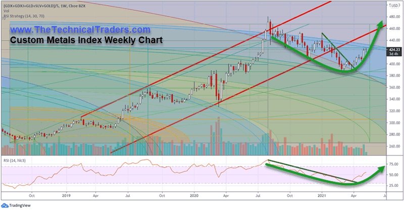 下面的“自定义金属指数周线图”突出显示了贵金属/矿产板块近期的价格上涨。密切注意这张图表上的红色价格通道以及最近价格顶部附近的浅蓝色拱形GANN风扇阻力水平。